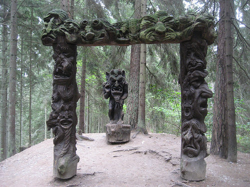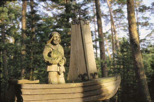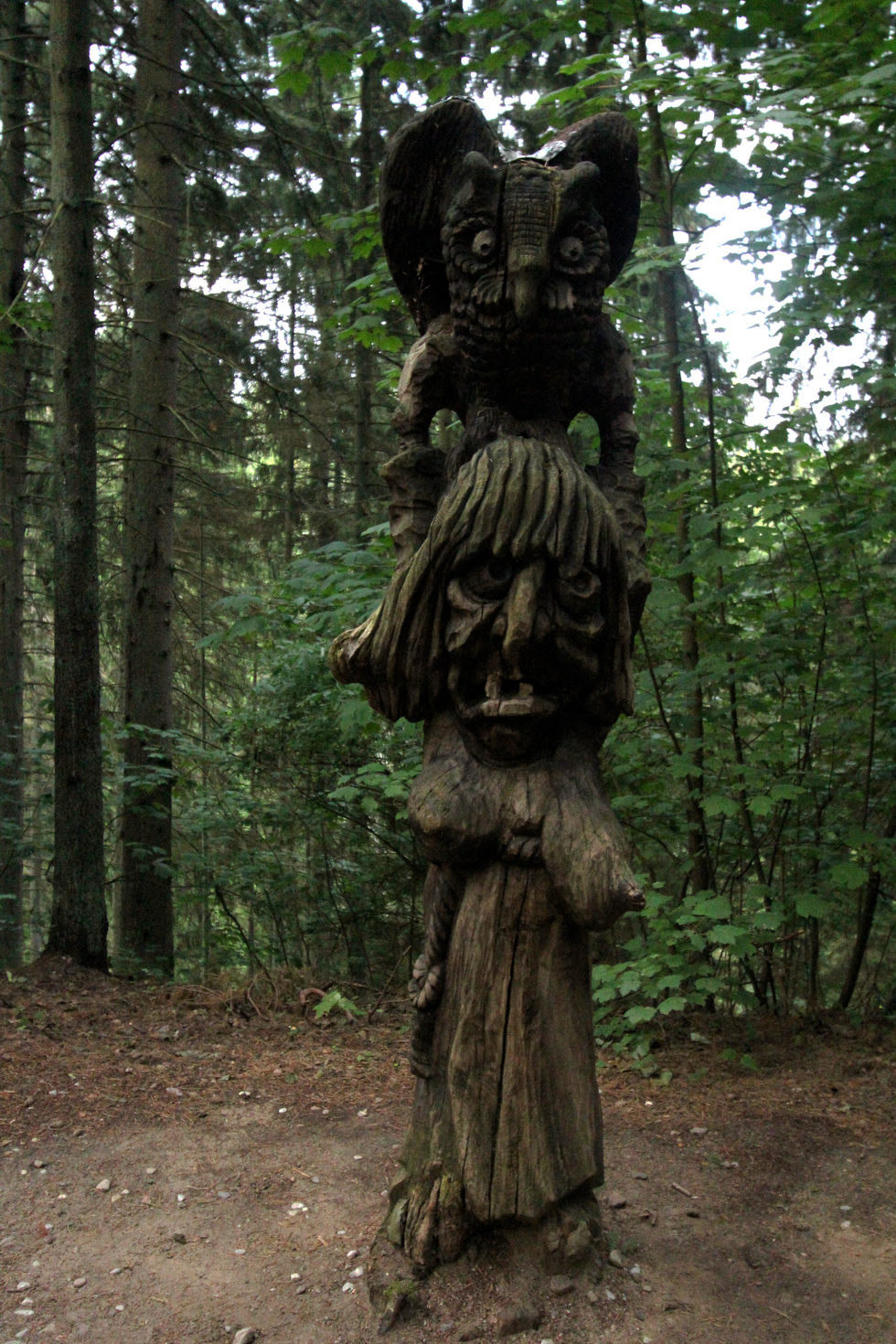 The Hill of Witches is in Juodkrante, Lithuania also known as Raganų Kalnas in Lithuanian. It is a public trail system through a forested sand dune just off the main road in Juodkrante. It overlooks The Baltic sea on one side and The Curonian Lagoon on the other side. The Hill itself is overgrown with huge pine trees that now stand as high as the eye can see. The forest is teeming with 80 mystical wood cravings such as devils, crow monsters and fairy tale creatures which all represent figures from Lituanian folklore and pagan traditions. Prior to WW1, Witches hill was the location used for a festival called Jonines (St. John’s Eve) Lithuanians would come from miles away to join in on the festival that took place on the 24th June.
