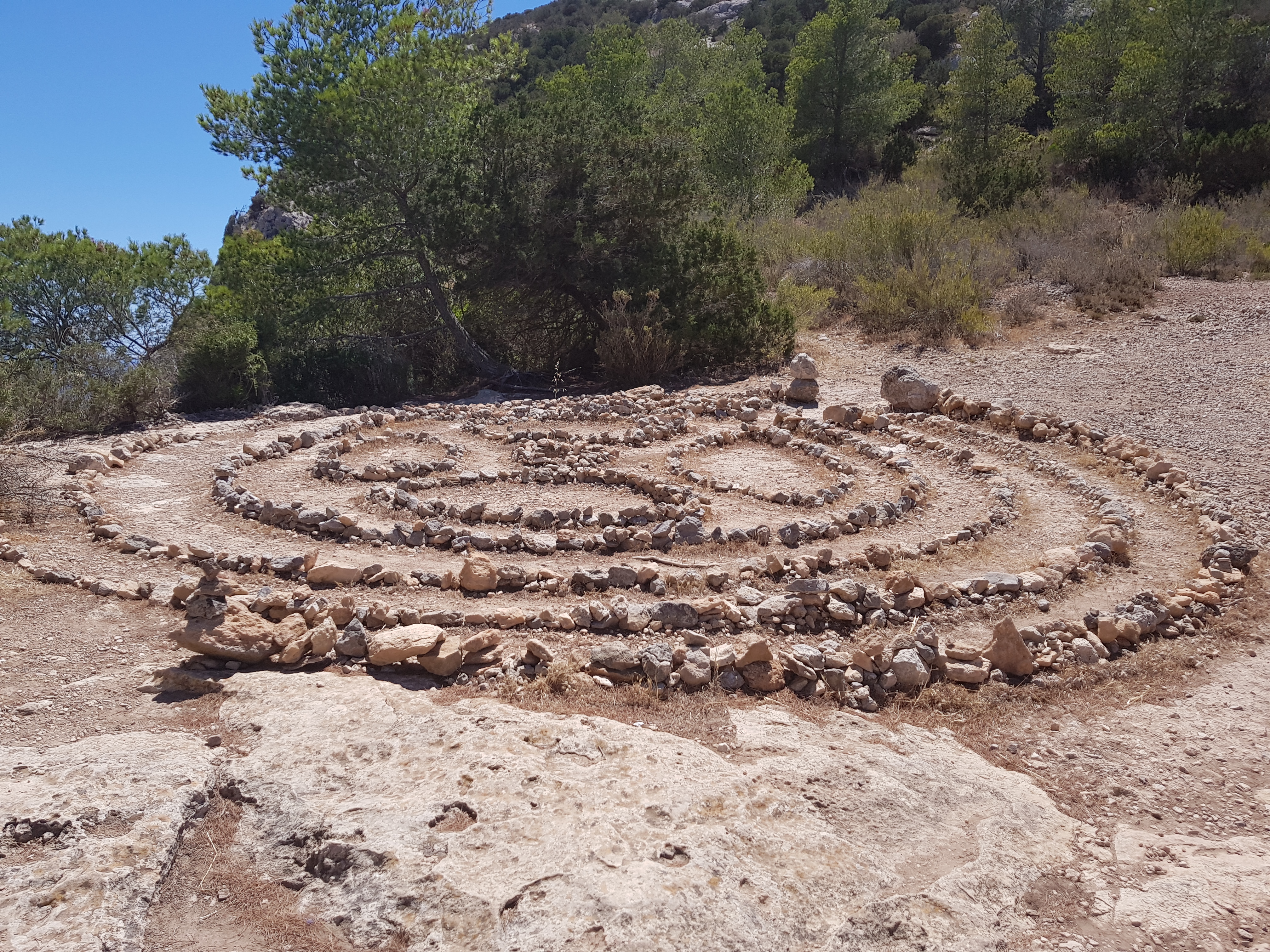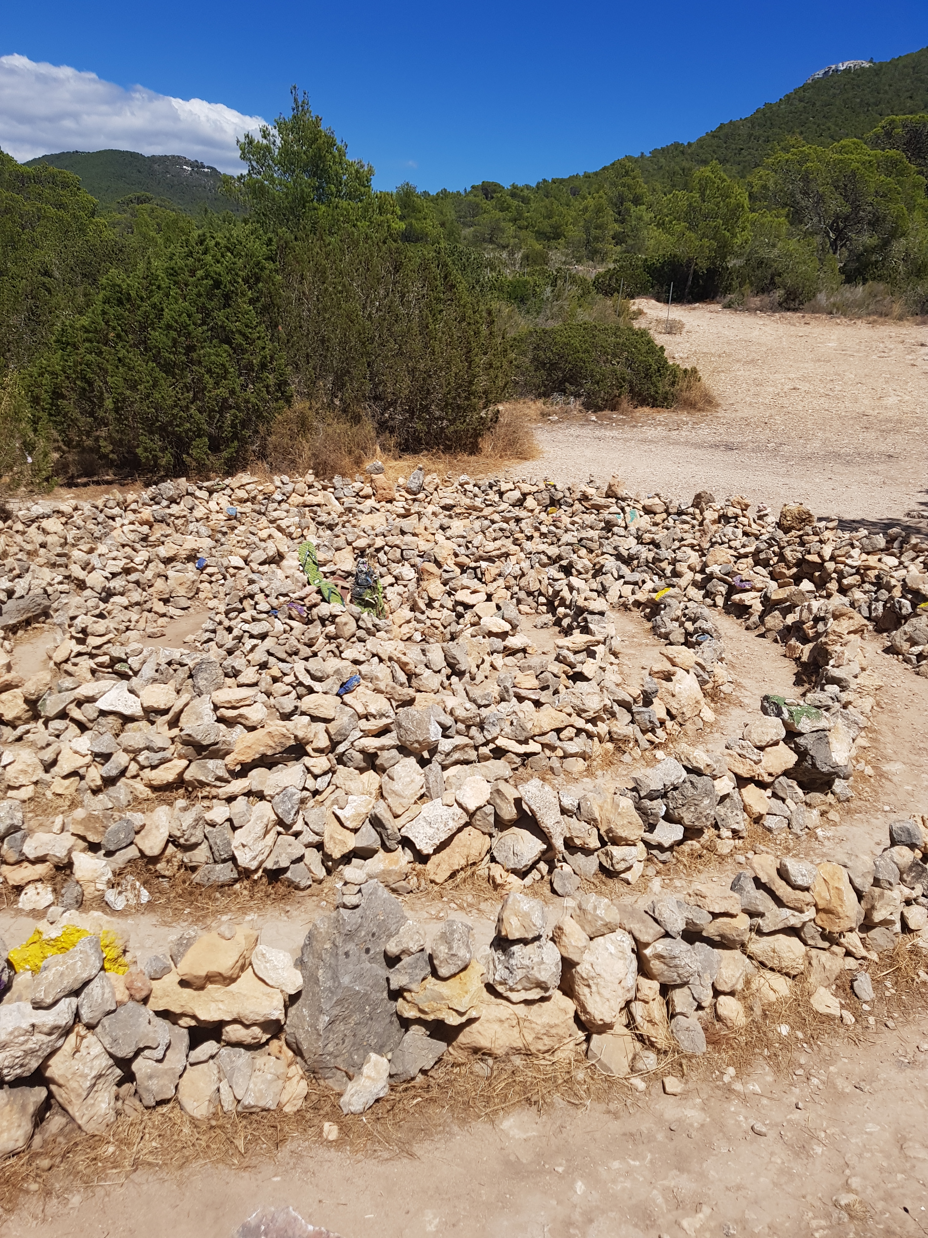 There is like a maze you then have to walk round which goes in a circle, once you have reached the middle there are what appears to be offerings placed there. I took off a chain and placed it there unsure if I was partipating correctly. I then wondered back out the circle and on leaving placed a stone onto the walls. It appears that this is what may happen as the walls have small and big stones placed on top of another and colourful stones people have coloured themselves.