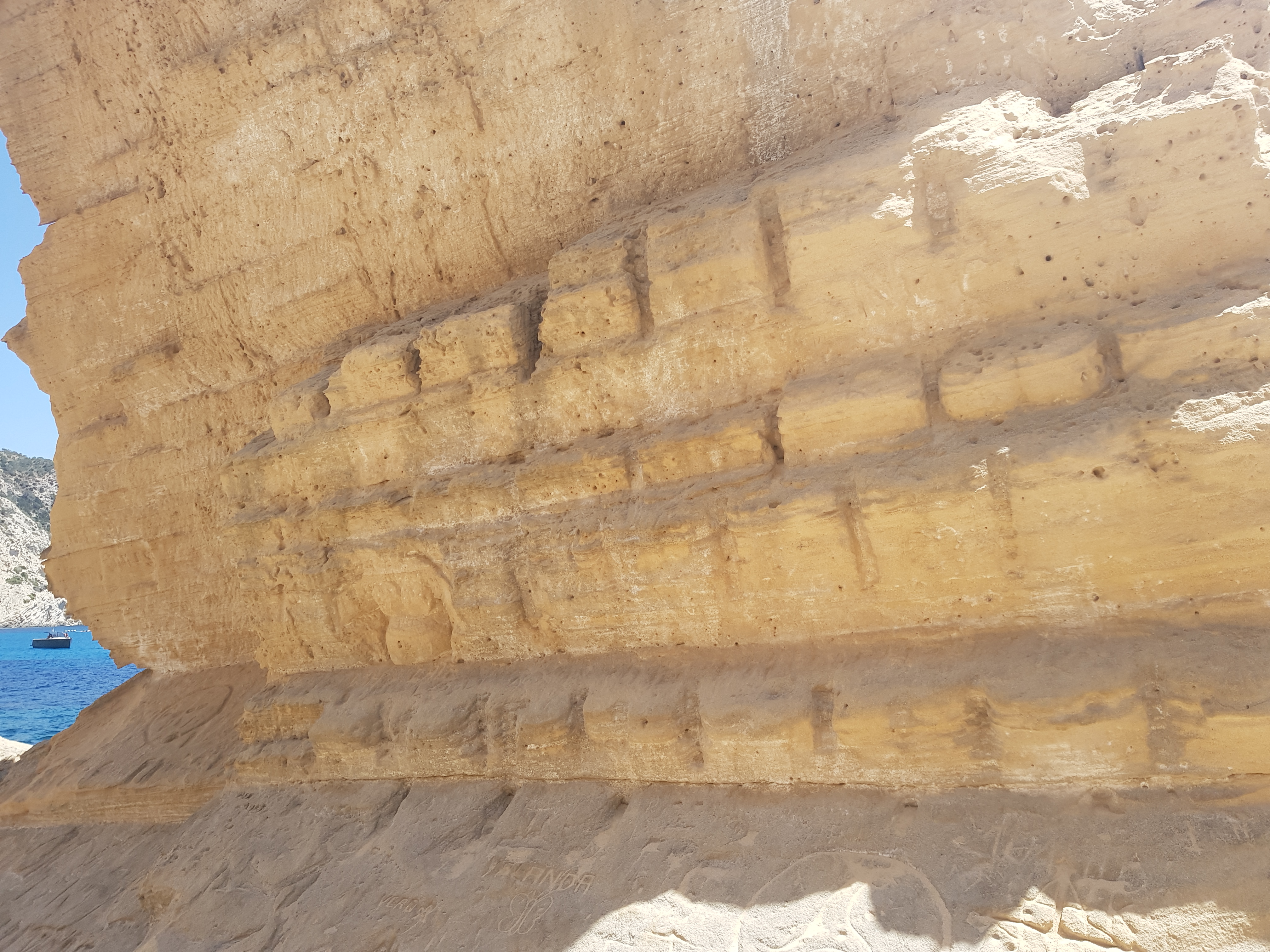 ‘Atlantis, as the hippies called this place in reference to the myth of the Atlantis island loss, is officially known as Sa Pedrera of Cala d’Hort. This is an old quarry from where the stones were removed to build part of the Dalt Vila walls in the XVI century. Furthermore, according to a legend these stones were also used for the Egyptian pyramids. The curious diagonal slashes of the rocks create strange stepped structures by where the water from the sea slips through and forms natural pools. Among the walls it can be found small altars, carved drawings and images, many of them Buddhist and Hindu symbols and divinities. Possibly due to the strong influence that these philosophies and Eastern religions had in the hippy movement.