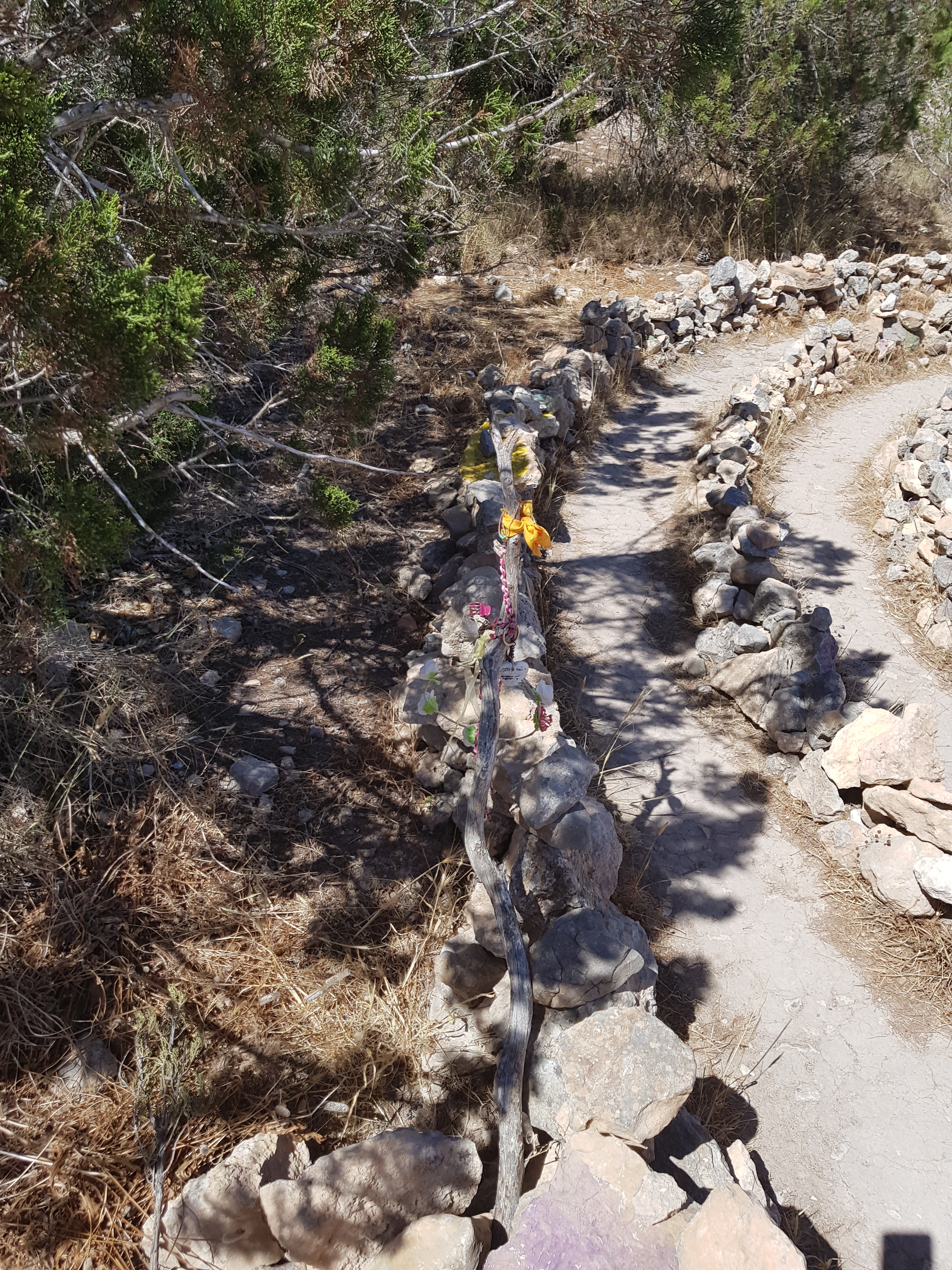I started to walk and reached the first viewing point looking over the cliff I was taking in by the breath taking views of the sea. A Couple appoached and from the point where im stood i could not see Es Vedra so i asked if they knew where it was. They stated it was further down the track and there was another viewing point and said you must go to see, it is said that it is full of good energy. I was a little suprised by the comment and felt i had needed to see it anyway. I then looked behind me to see what appeared to be rocks stacked. At this point my phone goes which I answer (this is a important part later).