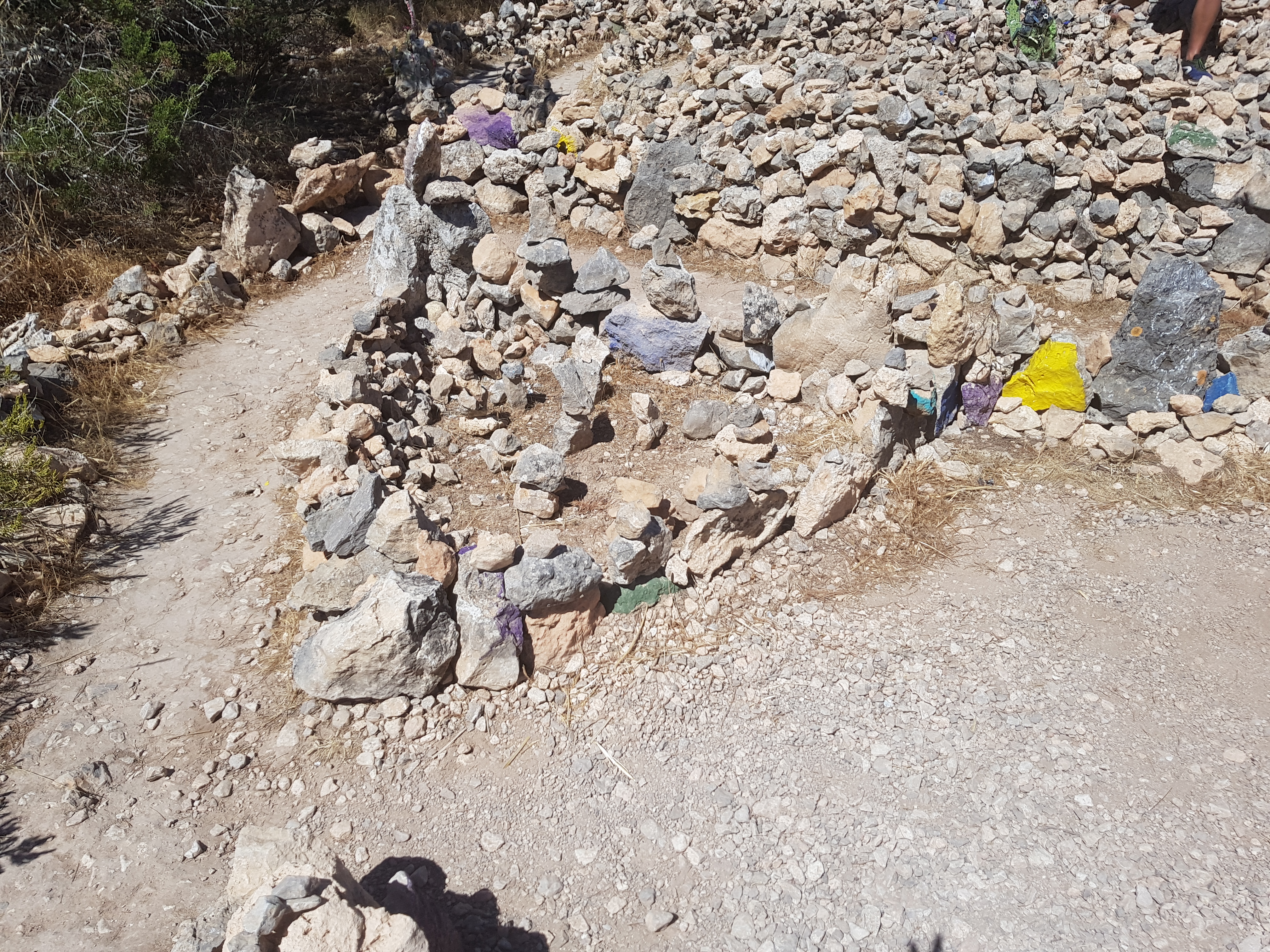 There is like a maze you then have to walk round which goes in a circle, once you have reached the middle there are what appears to be offerings placed there. I took off a chain and placed it there unsure if I was partipating correctly. I then wondered back out the circle and on leaving placed a stone onto the walls. It appears that this is what may happen as the walls have small and big stones placed on top of another and colourful stones people have coloured themselves.