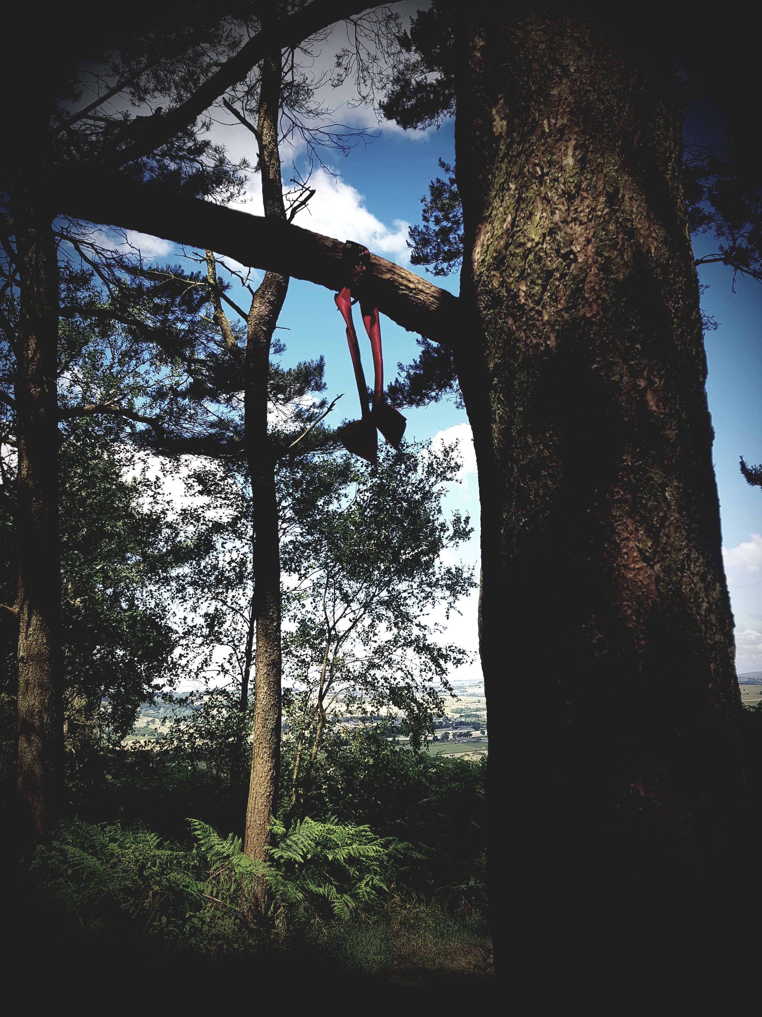 Red ribbons suggest the light dark where twigs arranged in a Blair witch style (as seen in the blue picture vaguely) is the darker.