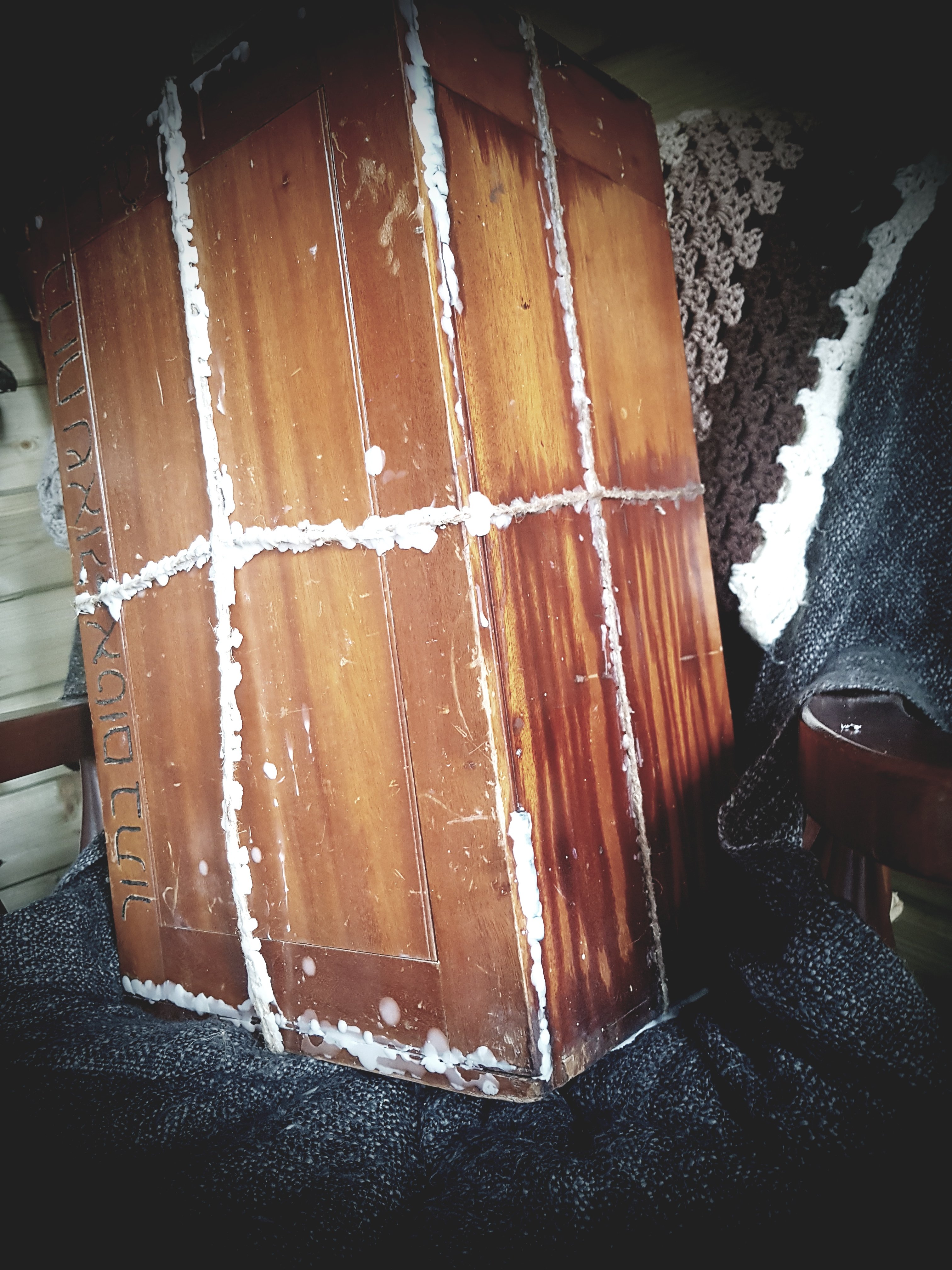 So yesterday, I had my magazines printed, I went to where the dybbuk box is located, picked it up and placed it down to take a picture of it with the magazine as I did I noticed a stain down the right hand side of it.