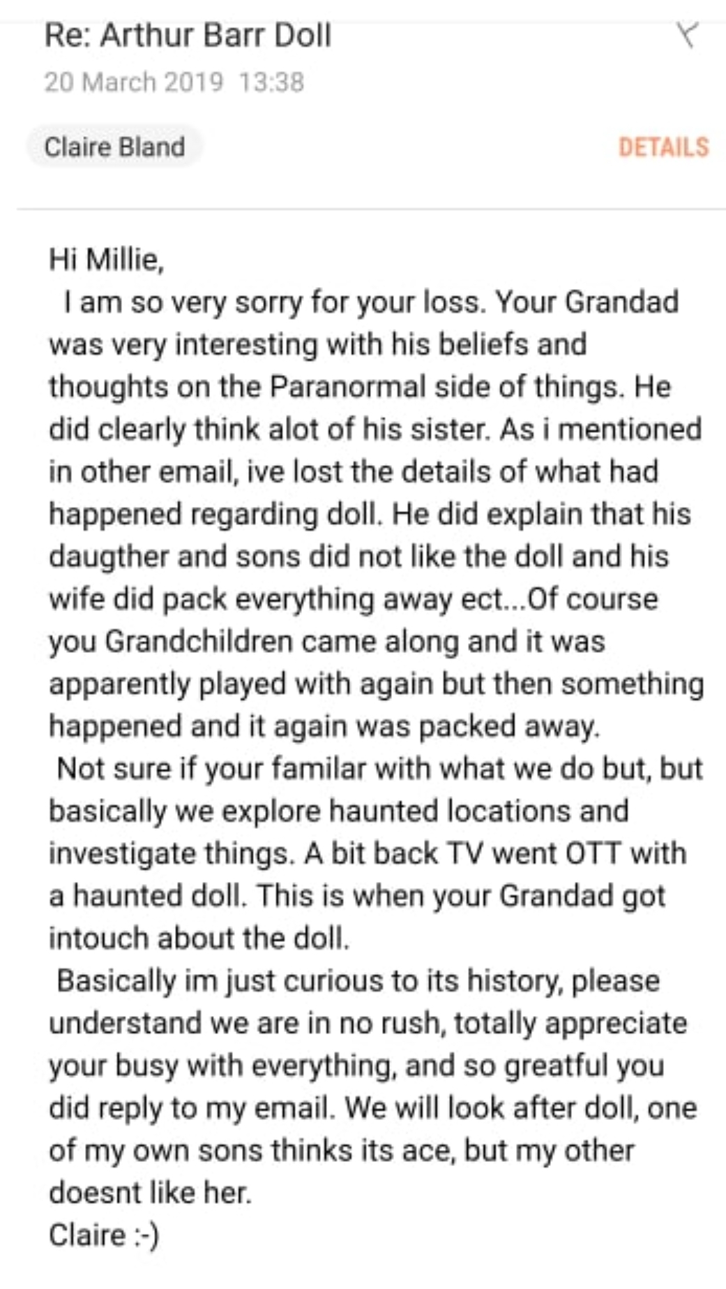 The doll was given to another child in the family, it would of been Arthur’s niece, but she died. Family put that down to the doll, but Millie says 2 other infants within the family died due to heart problems so that one also could of been a heart problem but no one knows. Things happen in house a lot, Arthur’s mother always said Elizabeth was with them, she had her cremated rather than a burial as they was suppose to move, and she wanted to keep her with them. They never moved as her husband became ill.
