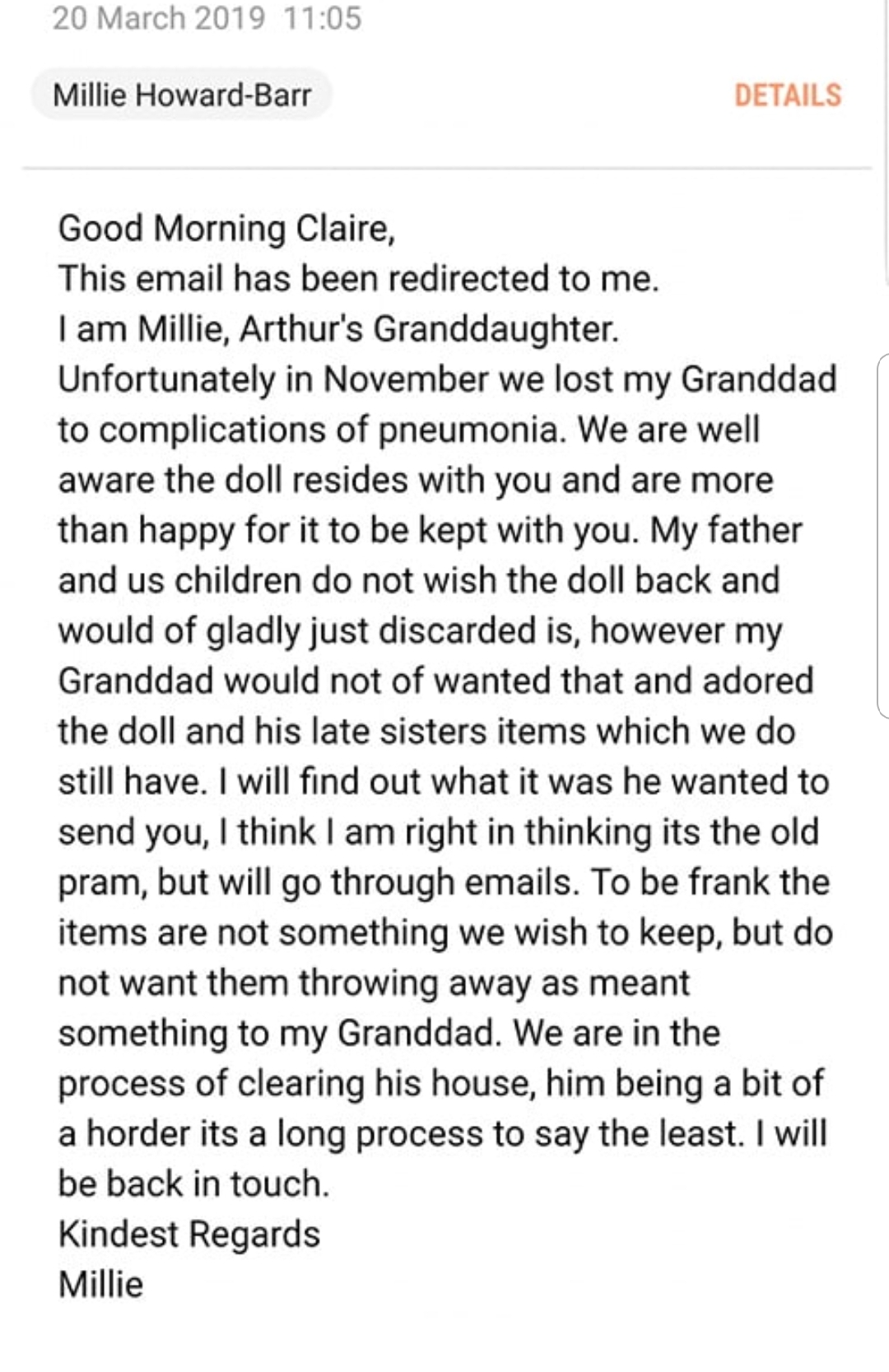 The family have always believed the doll to be called Clarissa, Arthur’s (the grandad) sister Elizabeth died just before she was 10, the doll is from 1950s they believe it was a either her 7th or 8th birthday that she got it.
