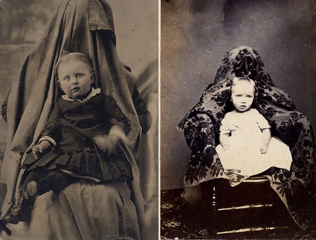 Early pioneering photographers in the late 1820s had to wait hours for camera exposures. Even though exposure times had been drastically cut down to about 30 seconds by Victorian times, mothers still had to go to very strange and creepy-looking measures to get their children to sit still for a photo. Babies had to be held by their mothers who, with the best of intentions, hid themselves in quite peculiar and creepy ways so they could calm their child and also stay out of the shot.
