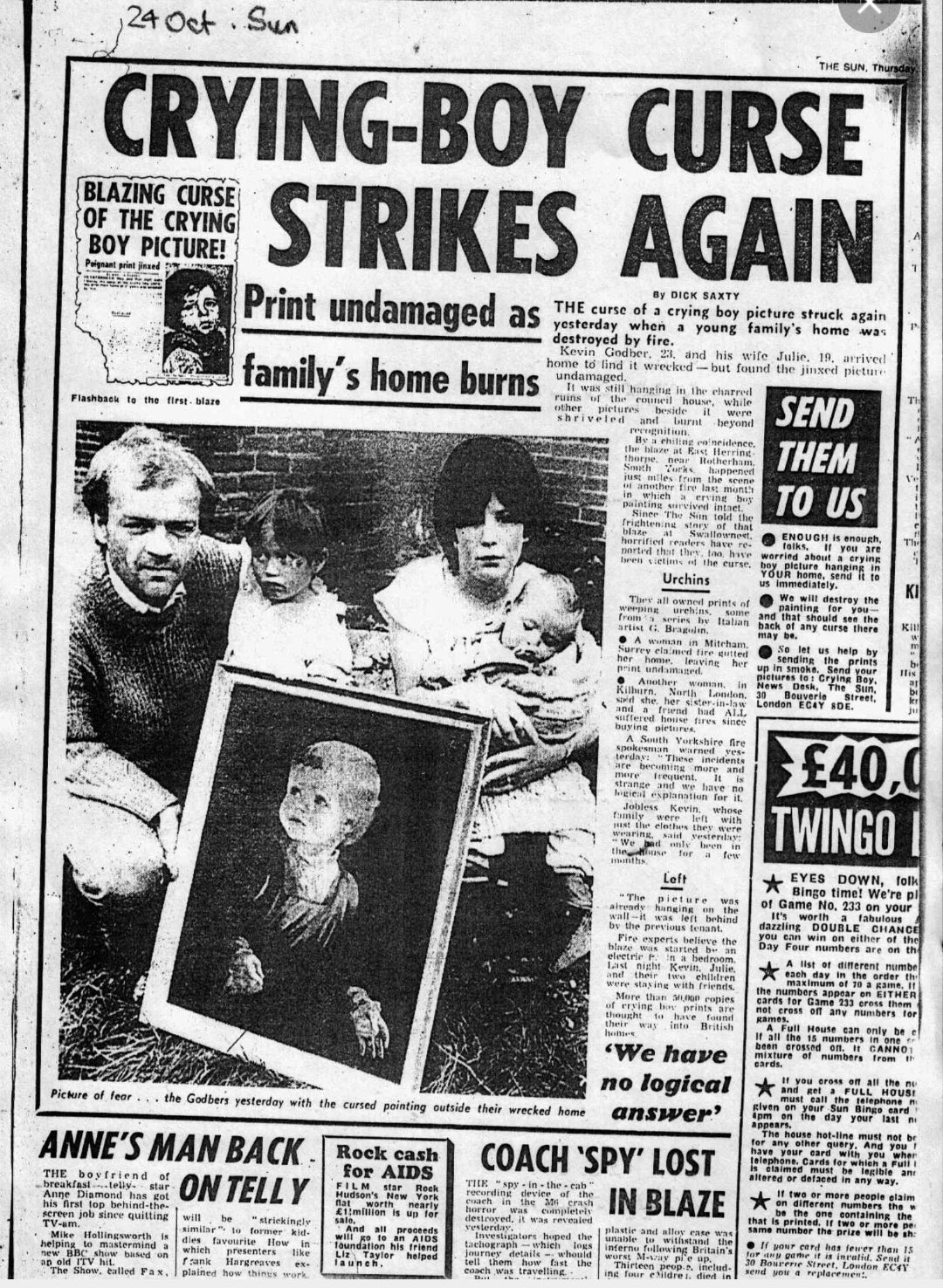 In September 1985, British newspaper ‘The Sun’ ran a report on some strange happenings surrounding the Crying Boy paintings.