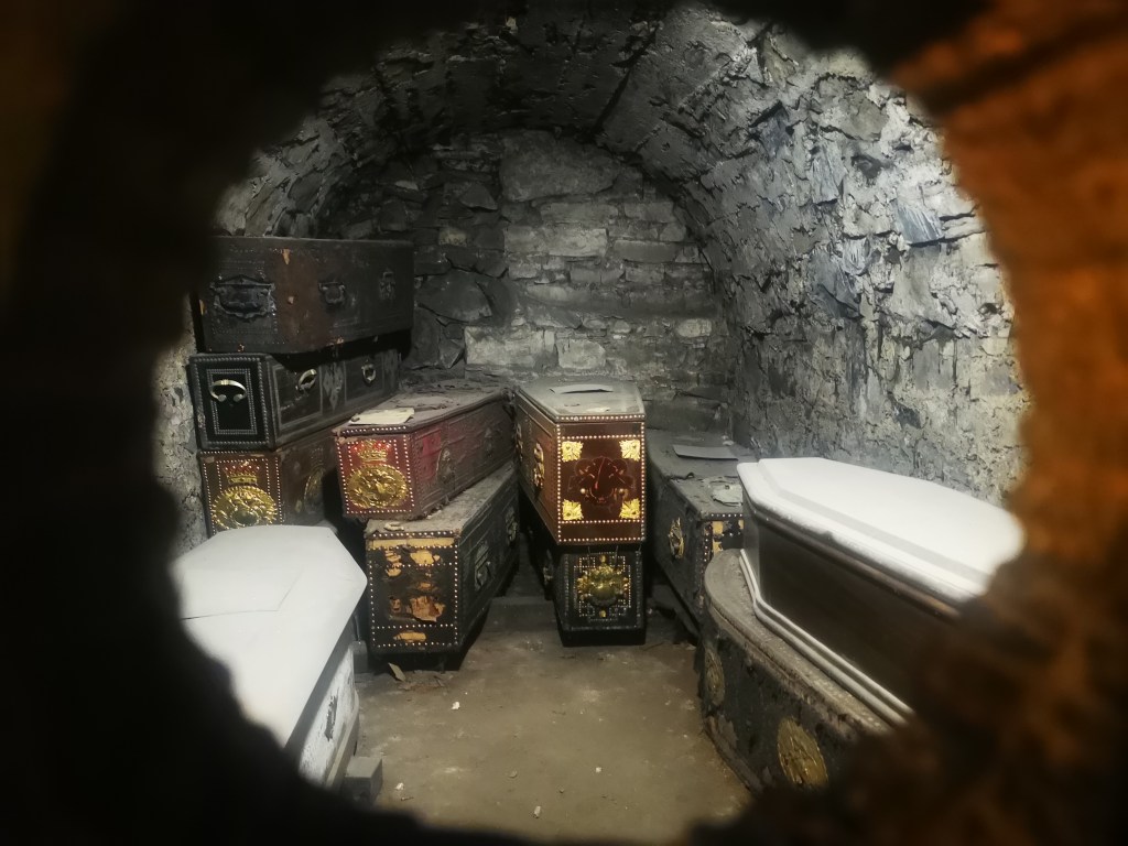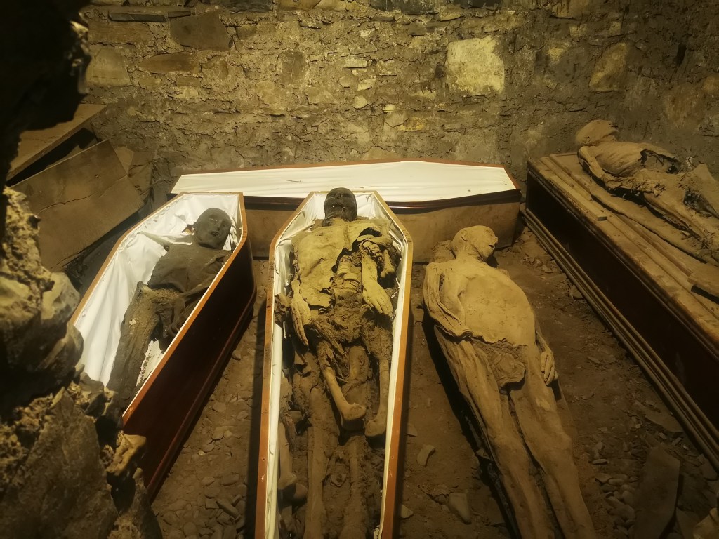 Still very life-like, their leathery skin is covered by a layer of dust. One of them, six-and-a-half foot tall, is believed to have been a soldier who returned from the Crusades. 800 years ago his height would have made him a veritable giant. He lies with his legs broken and crossed under him in order to fit in the coffin. He lies with one of his hands slightly in the air, stretched out of the casket; legend has it that those who touch his finger will have good fortune. Visitors were once encouraged to give it a shake…
