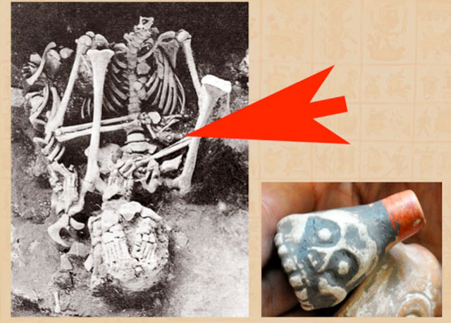In 1999, archaeologists excavating the temple of Tlatelolco discovered the skeletical remains of a 20 year old sacifrical victim who was holding two clay skull figures. At the time of discovery, historians assumed that the figurines was nothing more than toys and placed them in a musuem warehouse.