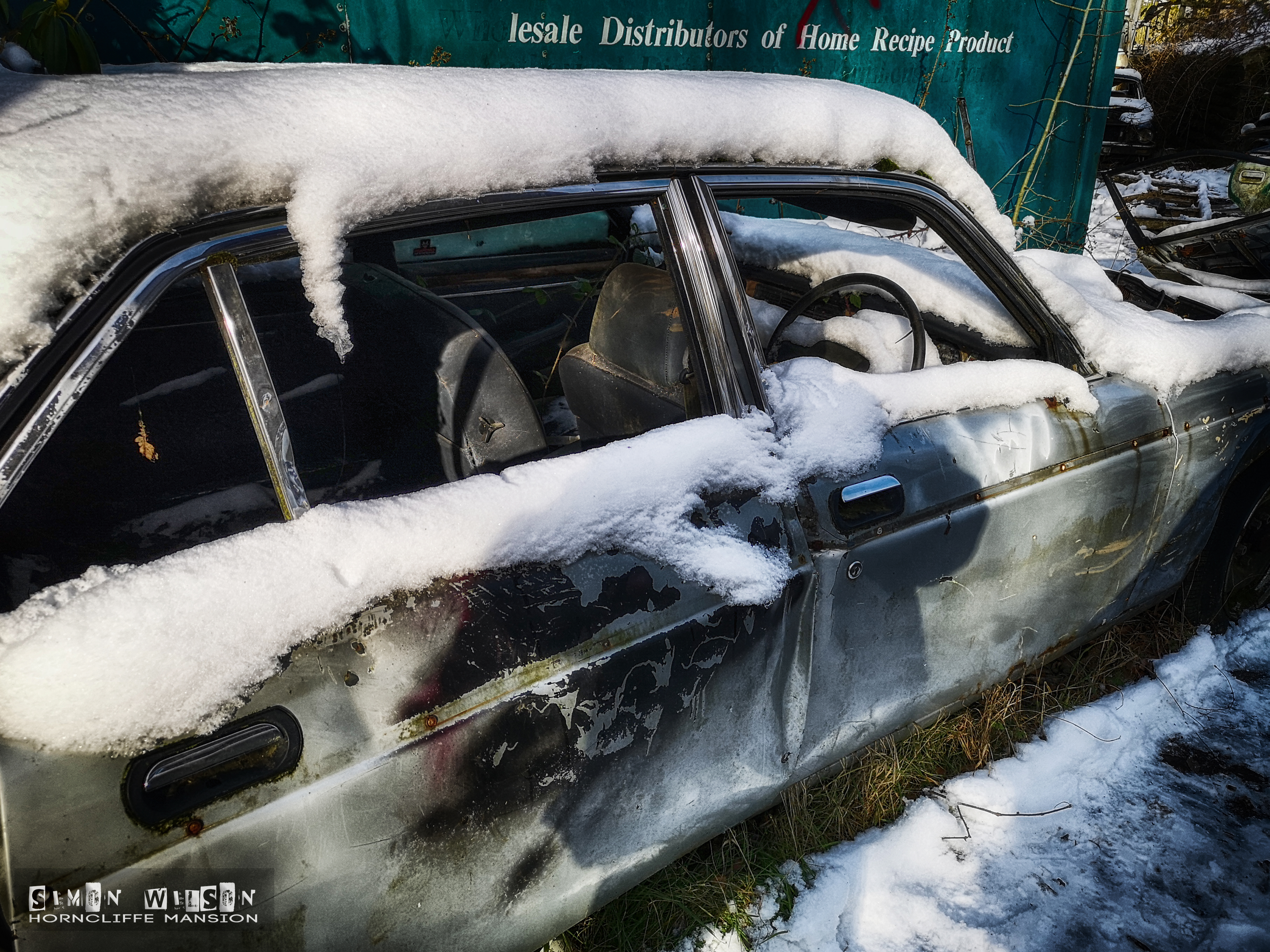 With snow underfoot; one early morning Rachel and I went to explore Hornclffe Mansion; the upper levels of the mansion are pretty much inaccessible unless you want to risk injury; the outside includes a large function hall and several jaguar cars laying out in the elements.