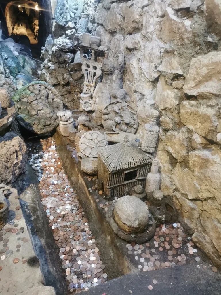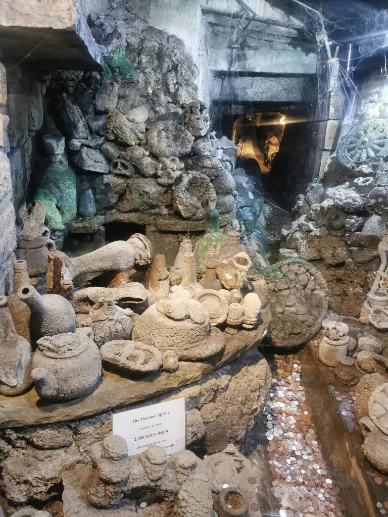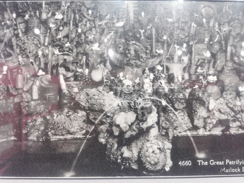 This is one of Matlocks Bath’s famous thermal springs. The water is rich in minerals, particularly calcium from the local limestone. As the water evaporates it leaves a deposit of calcium carbonate. The heavily mineralised water is spraying on to the objects encrusting them with lime salts and turning them to stone,