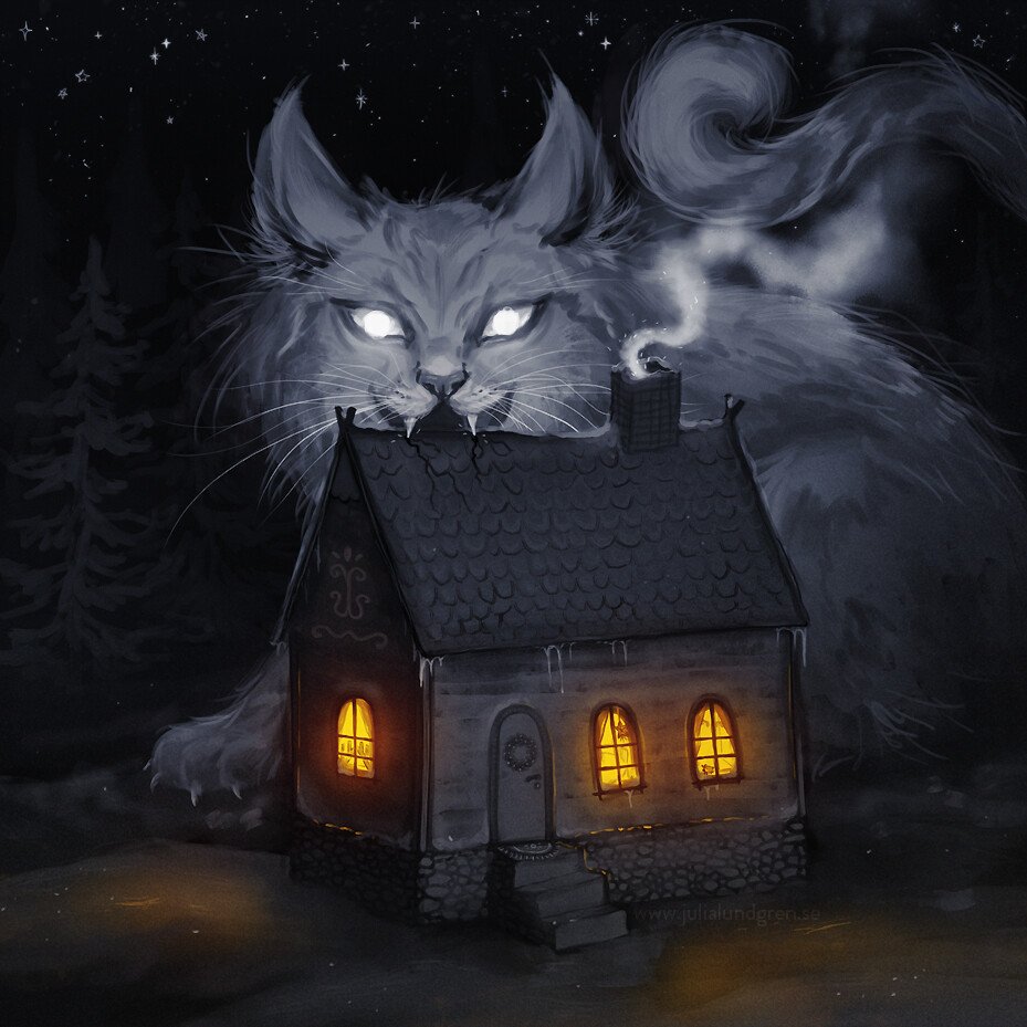 The Yule cat in Icelandic folklore is a huge and vicious cat who lurks about the snowy countryside during Christmas time (Yule) and eats people who have not received any new clothes to wear before Christmas Eve.
