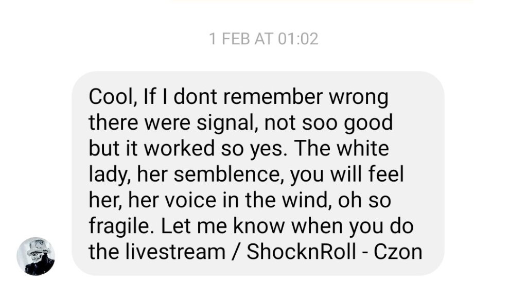 So with this information, I did. I visited and at the point of standing at the stairs, where the white lady is said to be, I called out and said I have a message for you from czon and I said if you understand me could you please say hello in English and as plain as day you hear the reply ‘HELLO’….